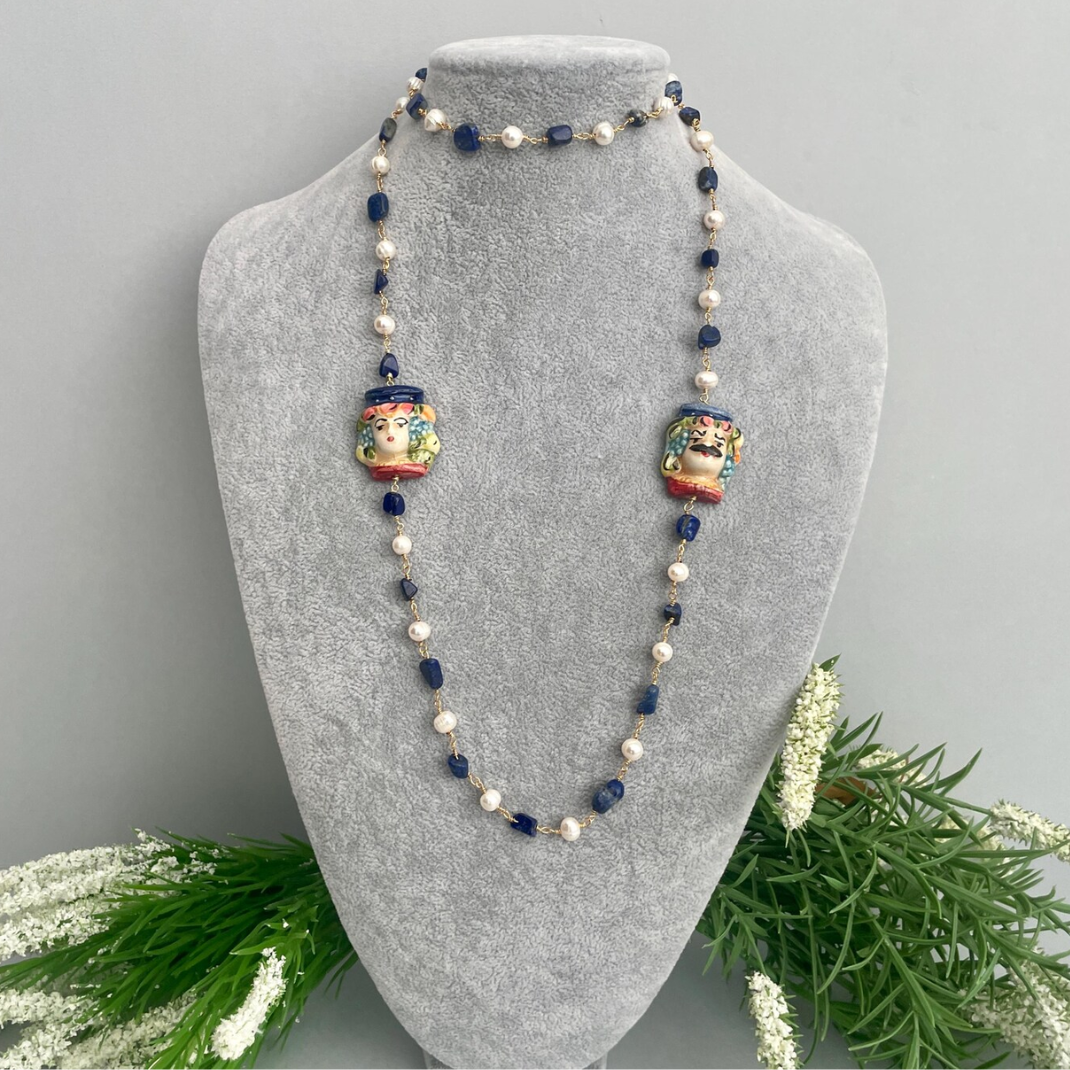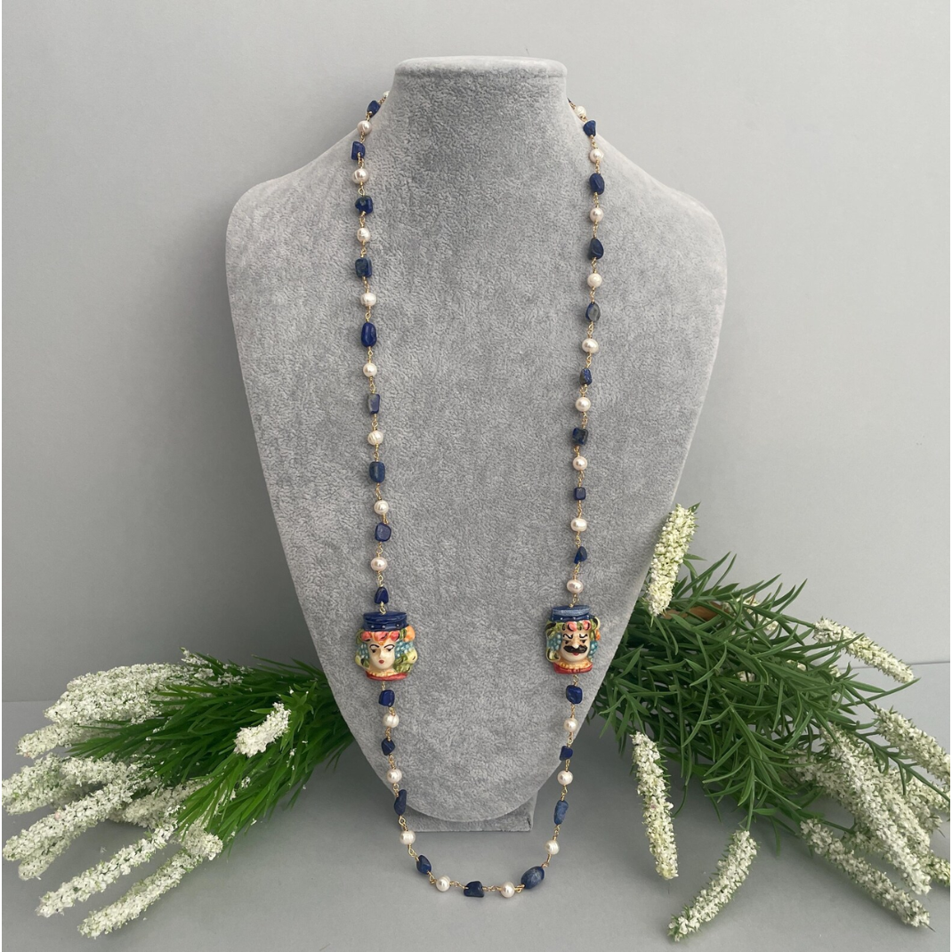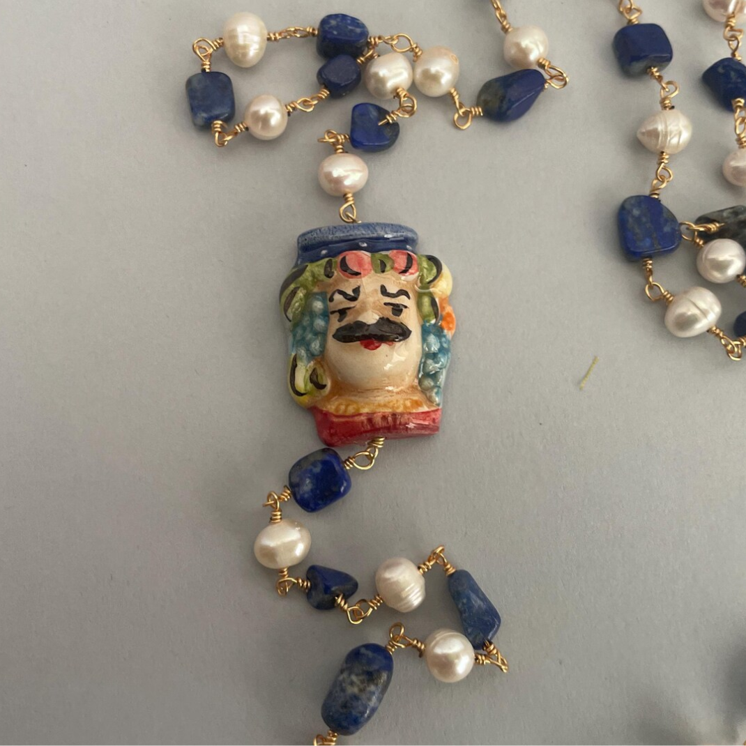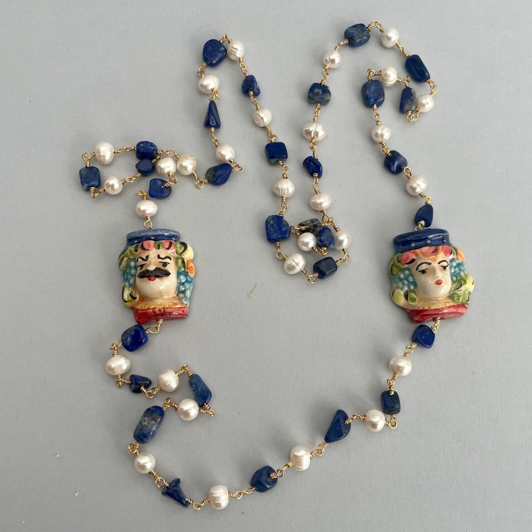 Cada elemento de este collar cuenta una historia. La fuerza del lapislázuli, la delicadeza de las perlas y la tradición de la cerámica siciliana crean una pieza única y especial.