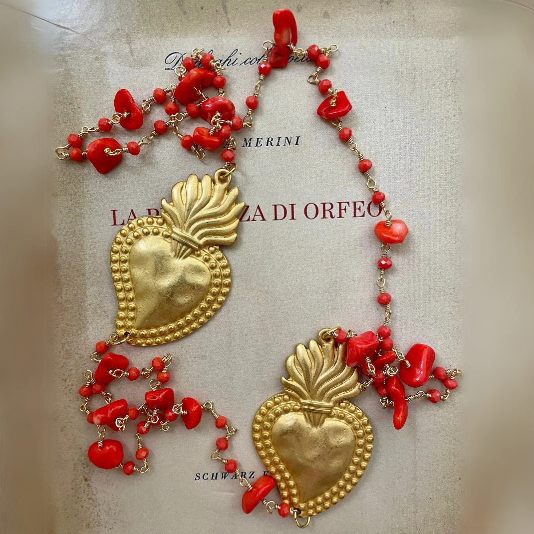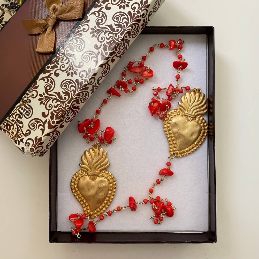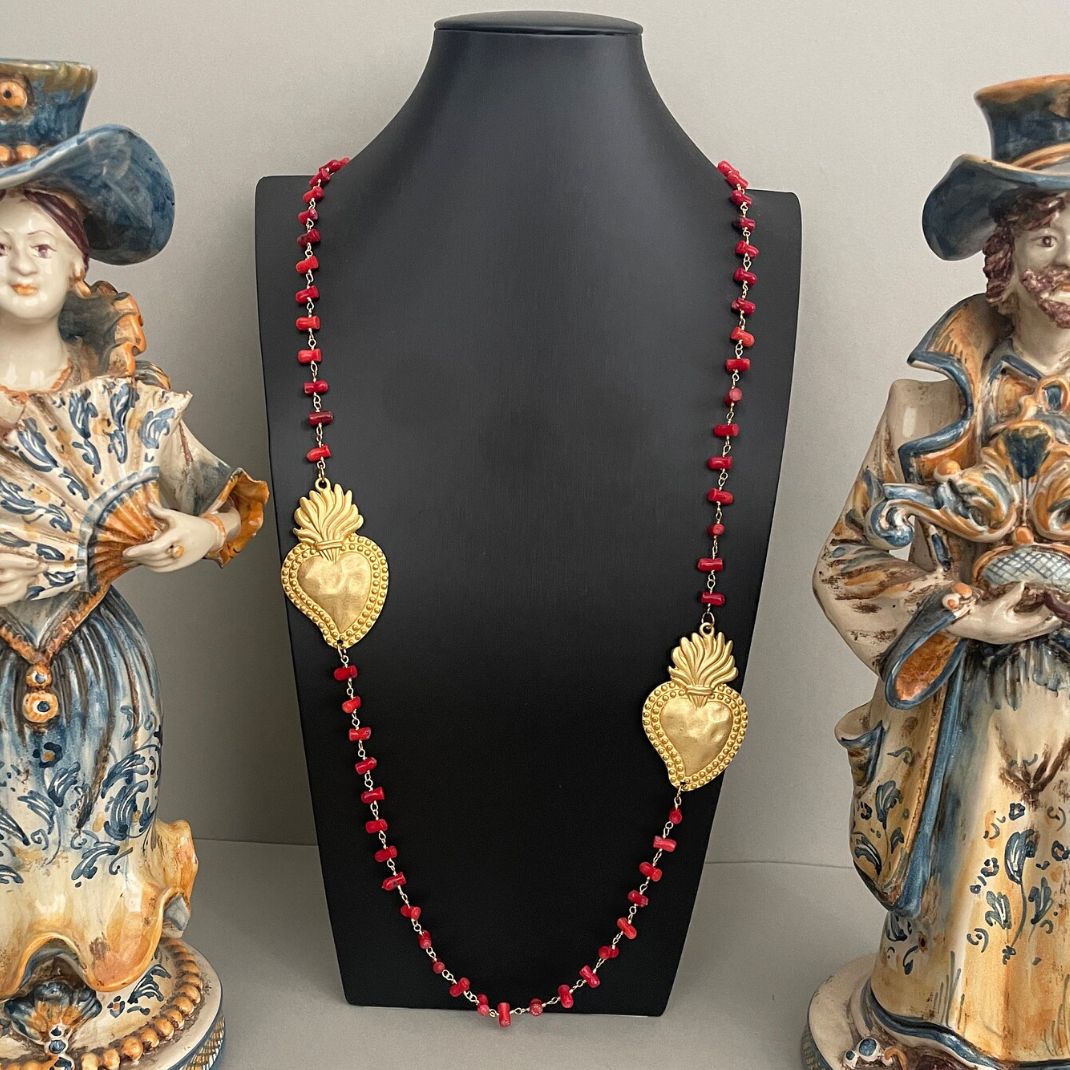 Hecho a mano con cadena tipo rosario y trozos de coral bambú, este collar largo combina tradición y modernidad con un estilo único y vibrante.