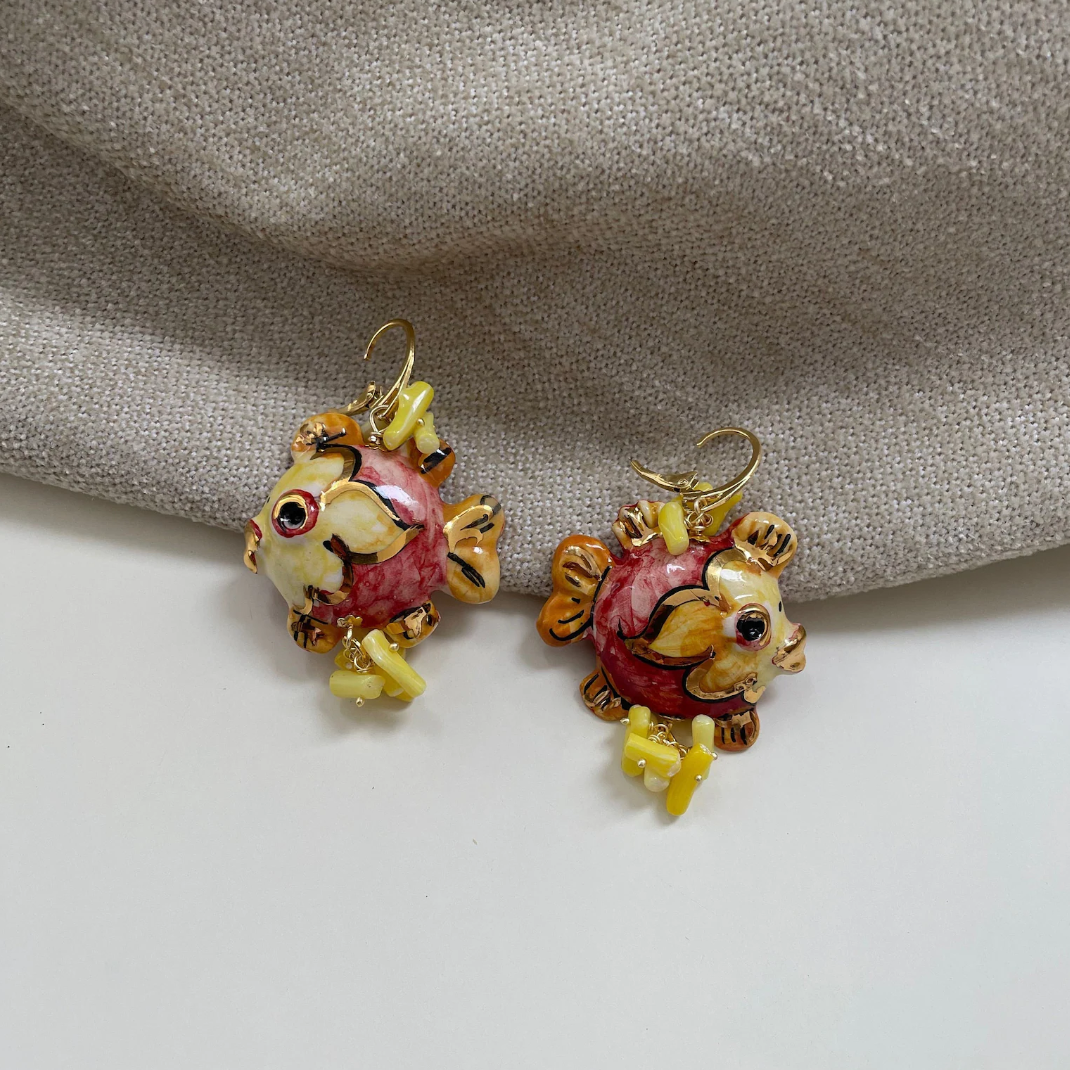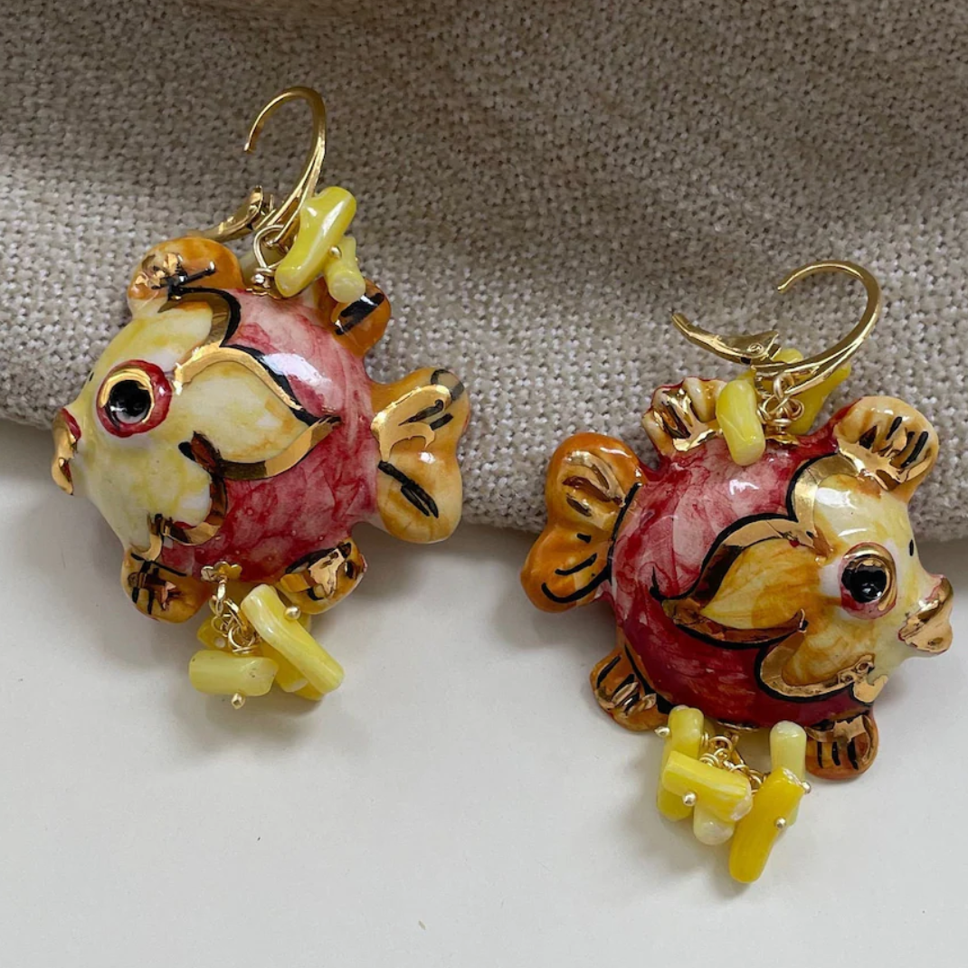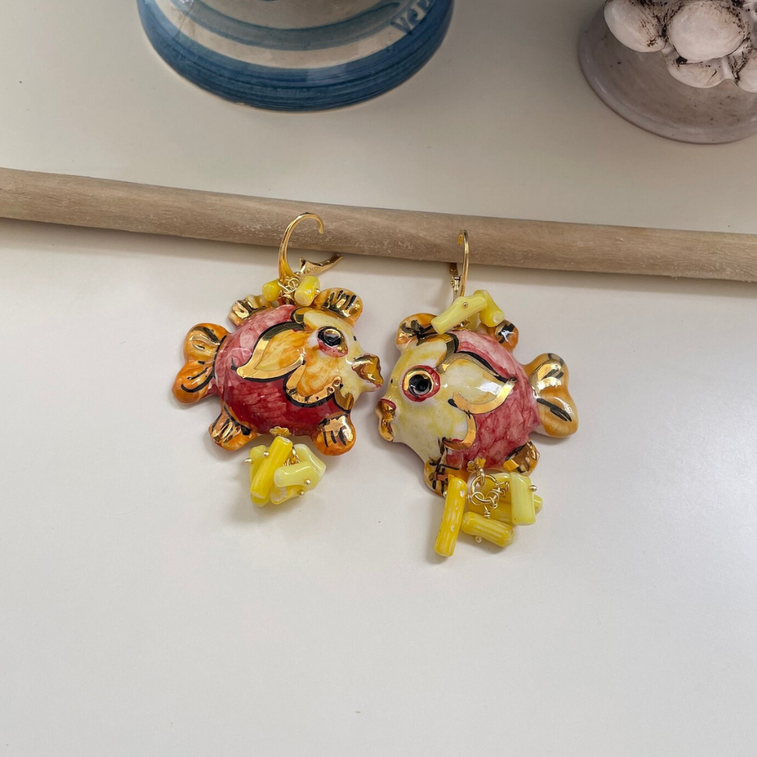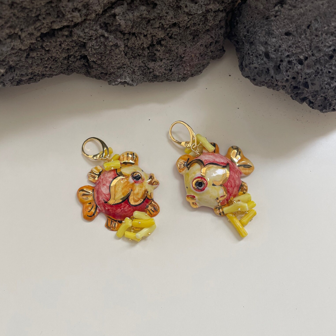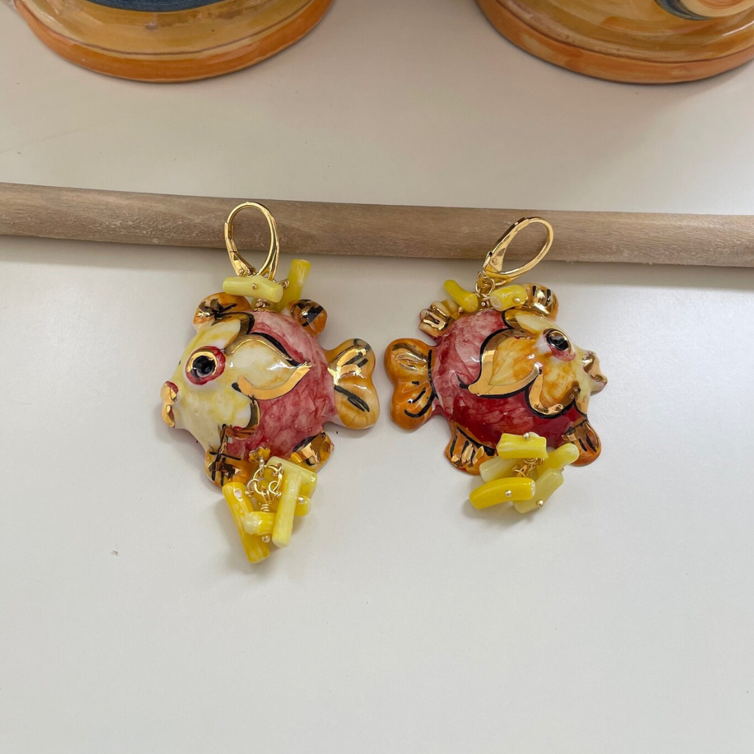 Pendientes con anzuelo de Plata 925 y pez de cerámica de Caltagirone pintado a mano. Un diseño artesanal inspirado en el mar y la tradición siciliana.