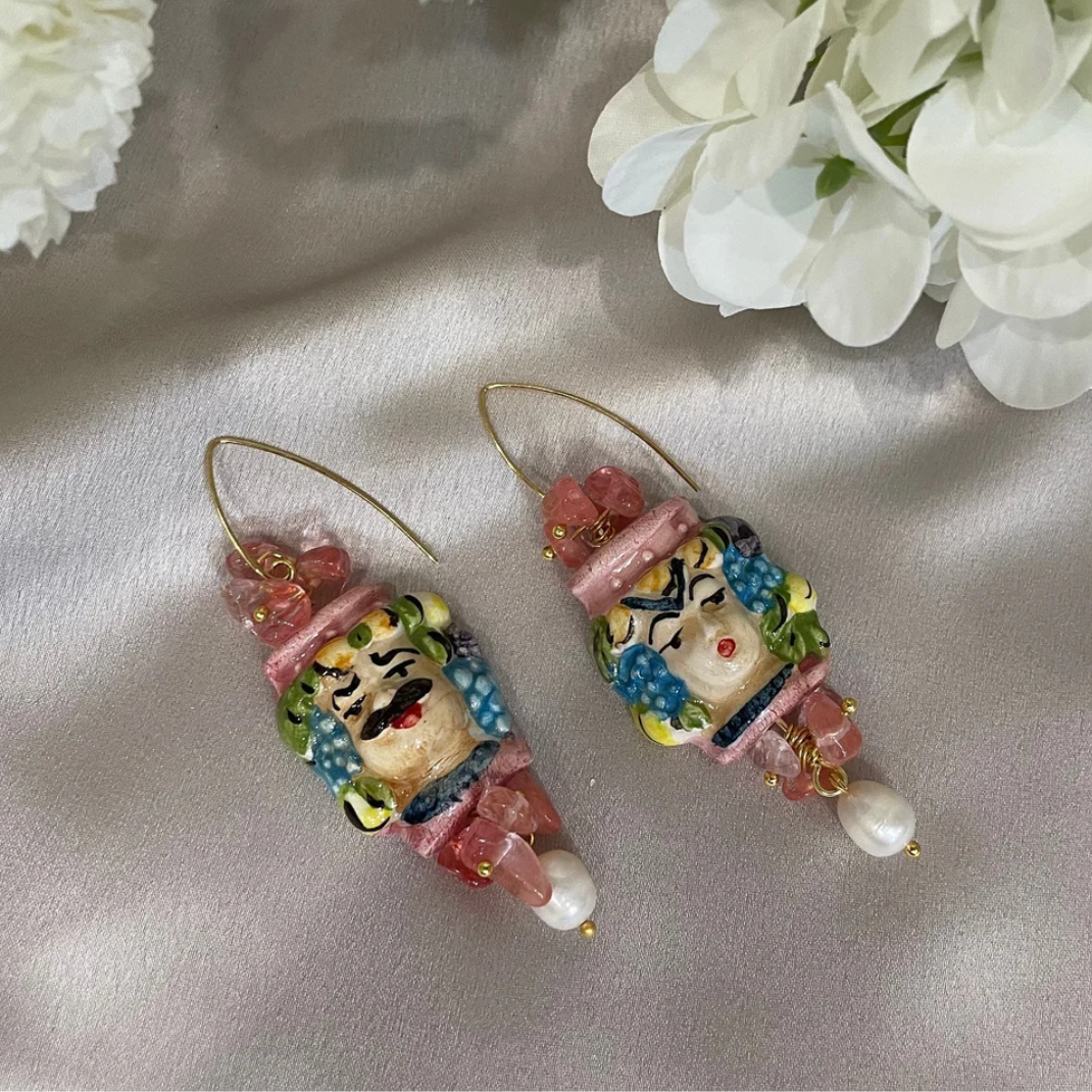 Pendientes con dos Cabezas de Moro de Caltagirone en tonos marrones, pintadas a mano en cerámica. Una joya que refleja la esencia de Sicilia.
