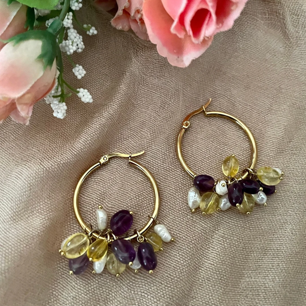 Pendientes de aro en latón con racimos de cuarzo citrino, amatista y perlas de río. Un accesorio delicado y lleno de brillo.